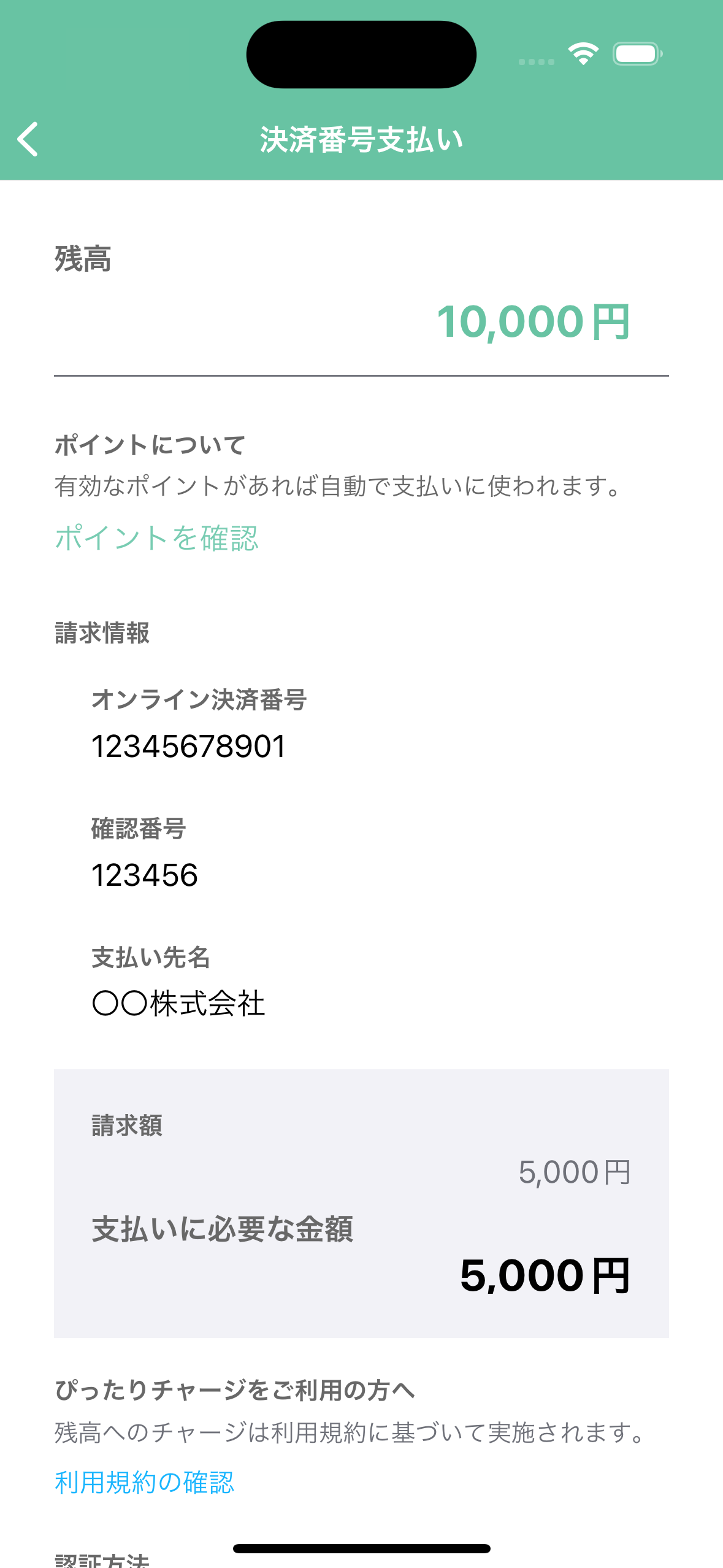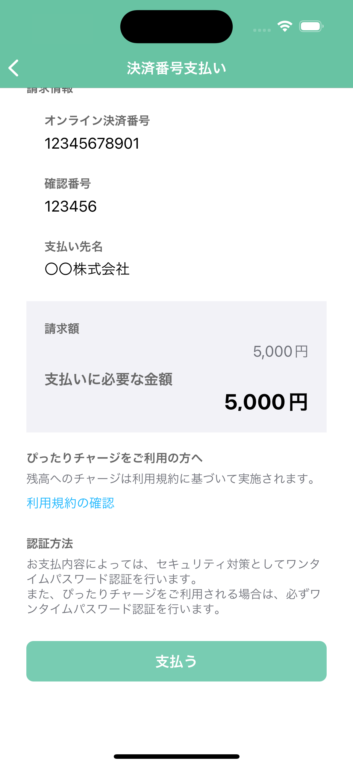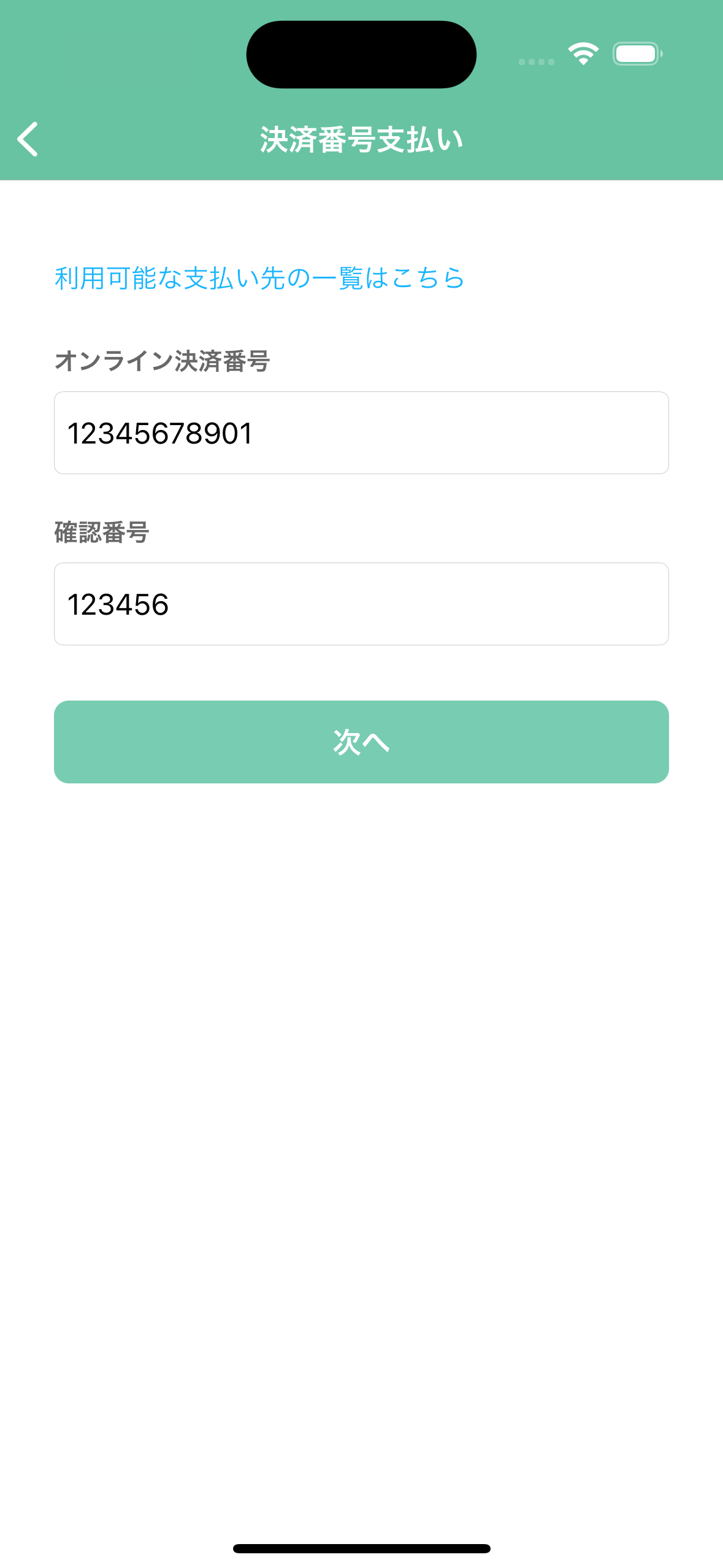 3. 商品購入時に案内される11桁のオンライン決済番号と、4~6桁の確認番号を入力し[次へ]をタップしてください。